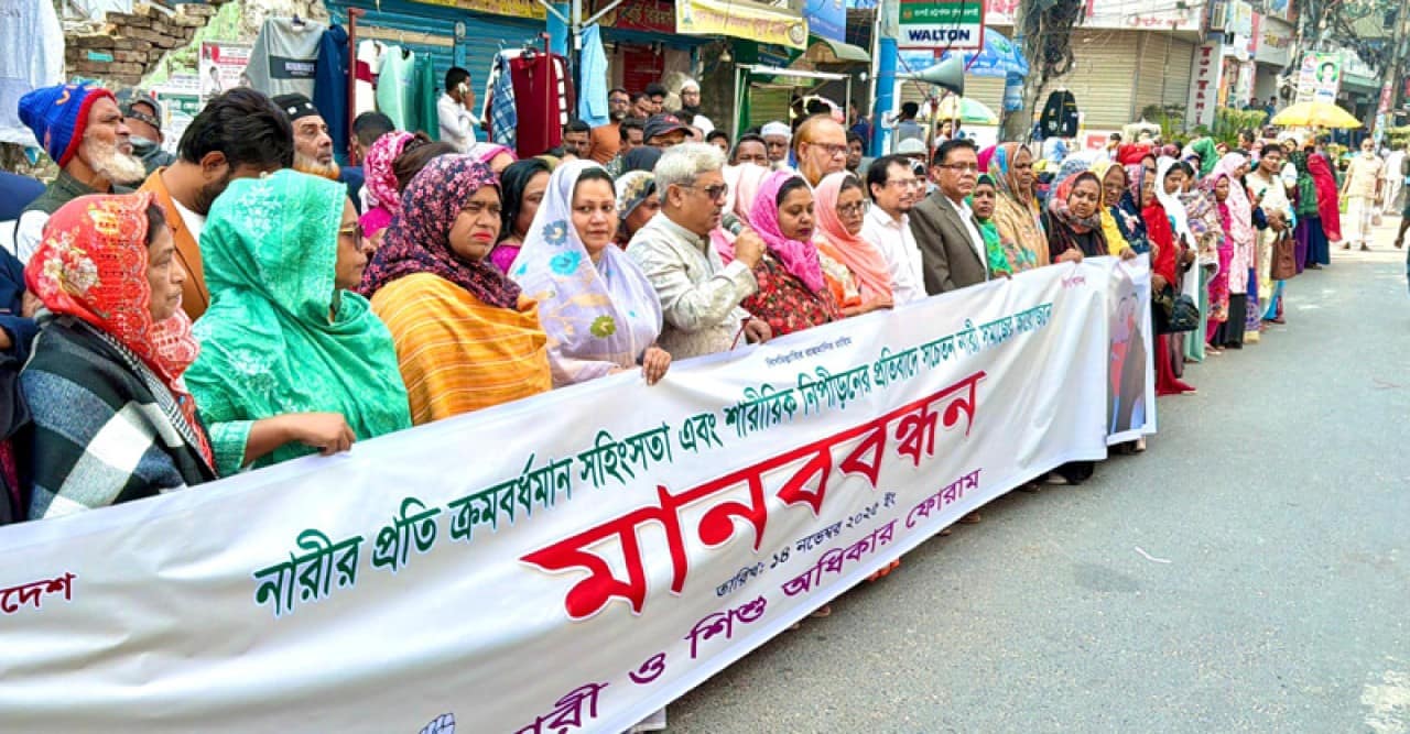 নিজস্ব প্রতিবেদক: রাজশাহীতে দুই নারীকে শারীরীকভাবে লাঞ্ছিত করার প্রতিবাদে মানববন্ধন কর্মসূচি পালিত হয়েছে। সচেতন নারী সমাজের ব্যানারে শুক্রবার সকাল ১০টা থেকে ১১টা পর্যন্ত রাজশাহী নগরের সাহেববাজার জিরোপয়েন্টে অনুষ্ঠিত এ মানববন্ধনে বিভিন্ন রাজনৈতিক ও সামাজিক সংগঠনের সদস্যরা অংশ নেন।