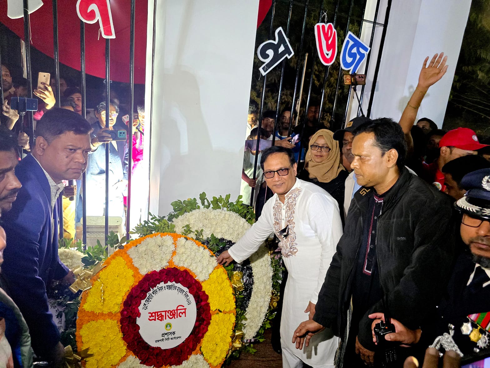 শ্রদ্ধা নিবেদনকালে রাজশাহী সিটি কর্পোরেশনের প্রধান নির্বাহী কর্মকর্তা মো. রেজাউল করিম, তত্ত্বাবধায়ক প্রকৌশলী (ভারপ্রাপ্ত) আহমদ আল আল মঈন, বাজেট কাম হিসাবরক্ষণ কর্মকর্তা মো. শফিকুল ইসলাম খান, প্রধান রাজস্ব কর্মকর্তা আবু সালেহ মো. নুর-ই-সাঈদ, নির্বাহী প্রকৌশলী (উন্নয়ন) মাহমুদুর রহমান, নির্বাহী প্রকৌশলী (উন্নয়ন) নিলুফার ইয়াসমিন, নির্বাহী প্রকৌশলী (পরিকল্পনা) সুব্রত কুমার সরকার, নির্বাহী প্রকৌশলী (বিদ্যুৎ) এবিএম আসাদুজ্জামান, রাজস্ব কর্মকর্তা মো. সারওয়ার হোসেন খোকন, উপ-প্রধান পরিচ্ছন্ন কর্মকর্তা সেলিম রেজা রঞ্জু, ,হিসাব রক্ষণ কর্মকর্তা নিজামুল হুদা, সিটি হাসপাতালের ইনচার্জ ও আবাসিক চিকিৎসা ডা. তরিকুল ইসলাম বনি, সহকারী প্রকৌশলী (যান্ত্রিক) শাহেদুজ্জামান জীবন, নগর পরিকল্পনাবিদ বনি আহসান, স্থপতি জহুরুল আনোয়ার অনন্ত, চীফ কমিউনিটি ডেভেলপমেন্ট অফিসার আজিজার রহমান, জনসংযোগ কর্মকর্তা মো. মোস্তাফিজুর রহমান, মনিটরিং কর্মকর্তা শাহরিয়ার রহমান জিতু, সহকারী জনসংযোগ কর্মকর্তা রকিবুল হক তুহিন, রাসিক কর্মচারী ইউনিয়নের সভাপতি মোঃ শাকিল, সাধারণ সম্পাদক মো. সানারুল ইসলাম ছবি সহ কার্যনির্বাহী কমিটির সদস্যবৃন্দ সহ অন্যান্য কর্মচারীবৃন্দ উপস্থিত ছিলেন।
