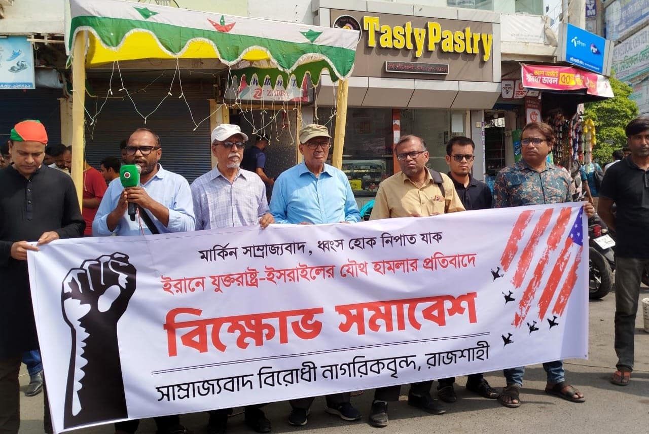 আজ সোমবার (২ মার্চ, ২০২৬) সকাল ১১টায় নগরীর গণকপাড়া মোড়ে সাম্রাজ্যবাদবিরোধী নাগরিকবৃন্দের আয়োজনে এই বিক্ষোভ সমাবেশ অনুষ্ঠিত হয়। সভাটি পরিচালনা করেন বরেন্দ্র ইয়ুথ ফোরামের সভাপতি আতিকুর রহমান আতিক, সভাপতিত্ব করেন নদী ও পরিবেশ গবেষক মাহবুব সিদ্দিকী।